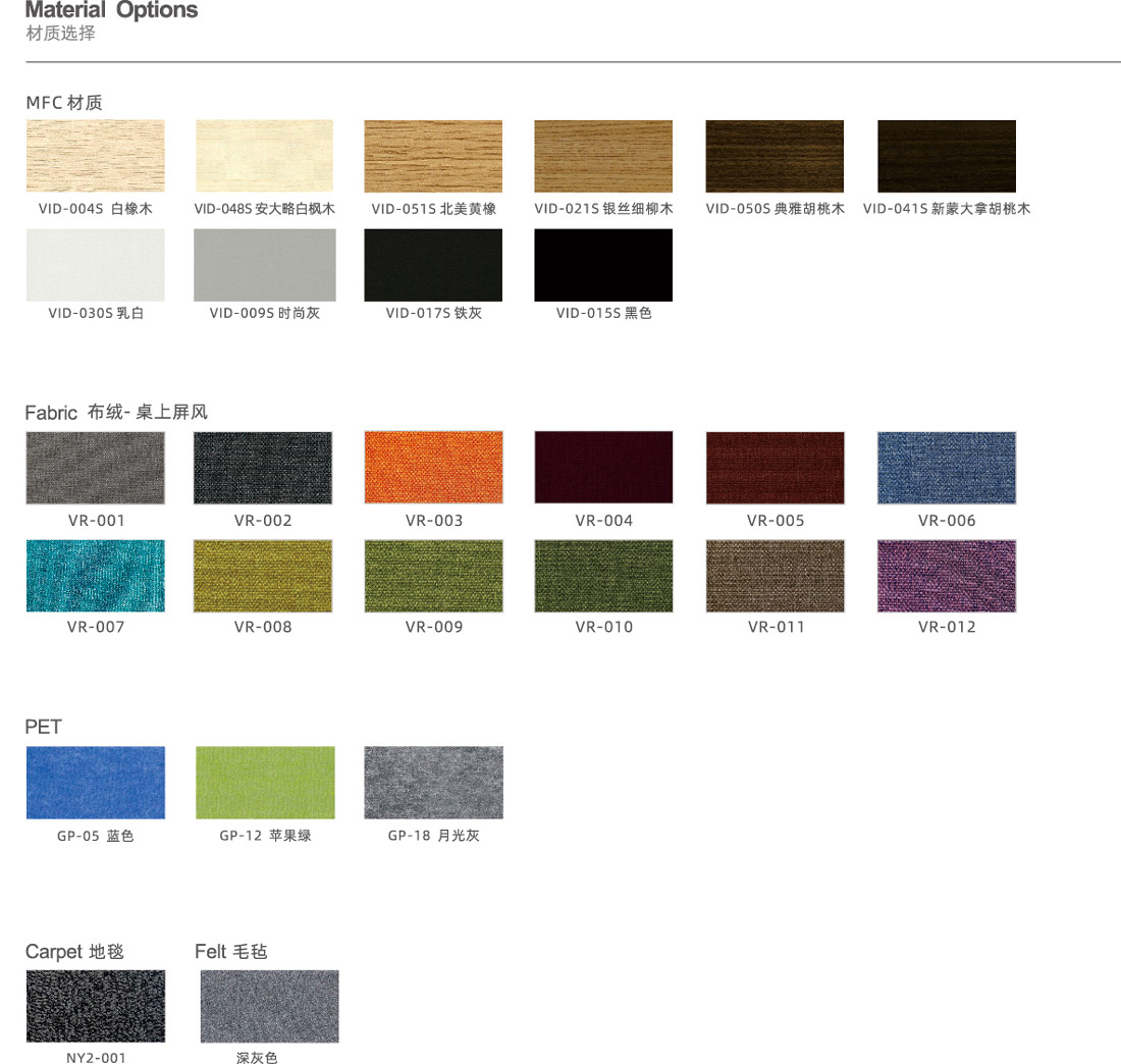 VID-041S新蒙大拿胡桃木、VID-030S乳白、VID-009S時尚灰、VID-017S鐵灰、VID-015S黑色